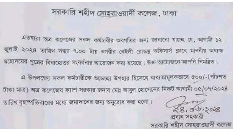 রাজধানীর সরকারি শহীদ সোহরাওয়ার্দী কলেজের অধ্যক্ষের ছেলের বিয়েতে উপহার হিসেবে বাধ্যতামূলক ৫০০ টাকা চেয়ে কর্মীদের নোটিশ দেওয়া হয়েছে। কলেজের সব